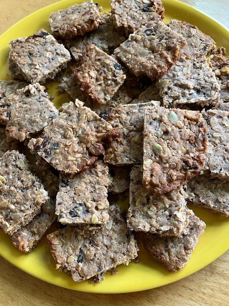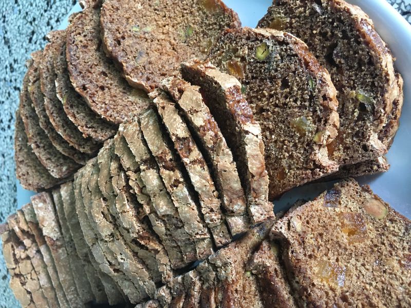 Een geheel Boheems programma! Daar past maar één soort koek bij: koláce. Een origineel Boheems recept met een gistdeeg bodem, maanzaad, povidl (pruimenmoes) en kwark, heerlijk. Iets bewerkelijker dan anders, maar groot succes. Origineel zijn dit koffiebroodjes, voor zoveel bezoekers bakte ik het als plaatkoek. Voor 1 bakplaat: 1 pak witbroodmix (of mix voor pizzabodem – in elk geval gistdeeg, en zonder kruiden of specerijen) met 2 dl water, 70 gram suiker, geraspte schil van 1 citroen (of sinaasappel) en 80 gram gesmolten boter kneden en laten rijzen. Drie vullingen maken. 1-kwarkvulling: 60 gram boter met 180 gram suiker romig kloppen. 50 gram kwark, 2 eidooiers, 30 gram maïzena en 1 eetlepel rum toevoegen, op het laatst 2 stijf geklopte eiwitten er door spatelen. 2-maanzaadvulling: 150 ml kokende melk op een mengsel van 150 gram maanzaad en 50 gram suiker gieten. 3-pruimenmoes: 200 gram gedroogde pruimen laten wellen en tot moes roeren (of: ik had het nog in huis: een potje povidl uit Tsjechië). Gistdeeg uitrollen, hierop de pruimenmoes uitsprijden en daarover heen de andere twee vullingen verdelen zodanig dat elk stukje ook de twee andere vullingen heeft. Circa 20 minuten bakken bij 200 graden.